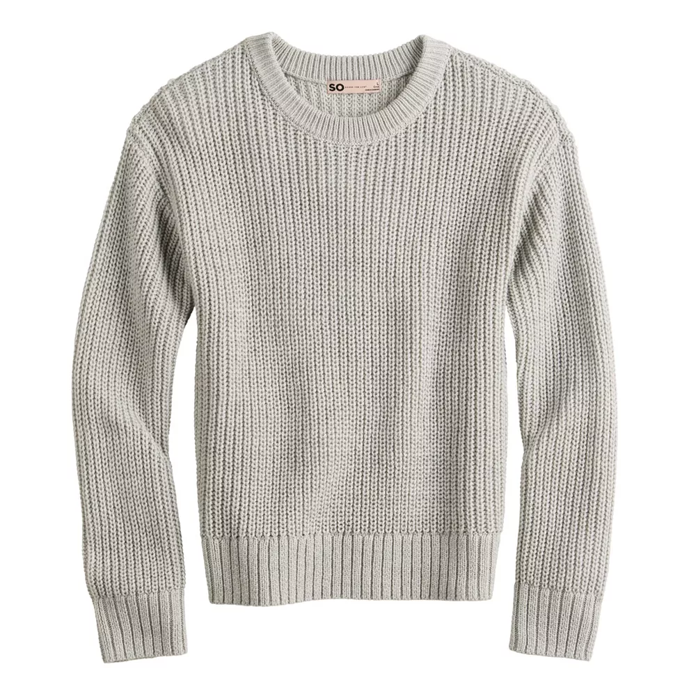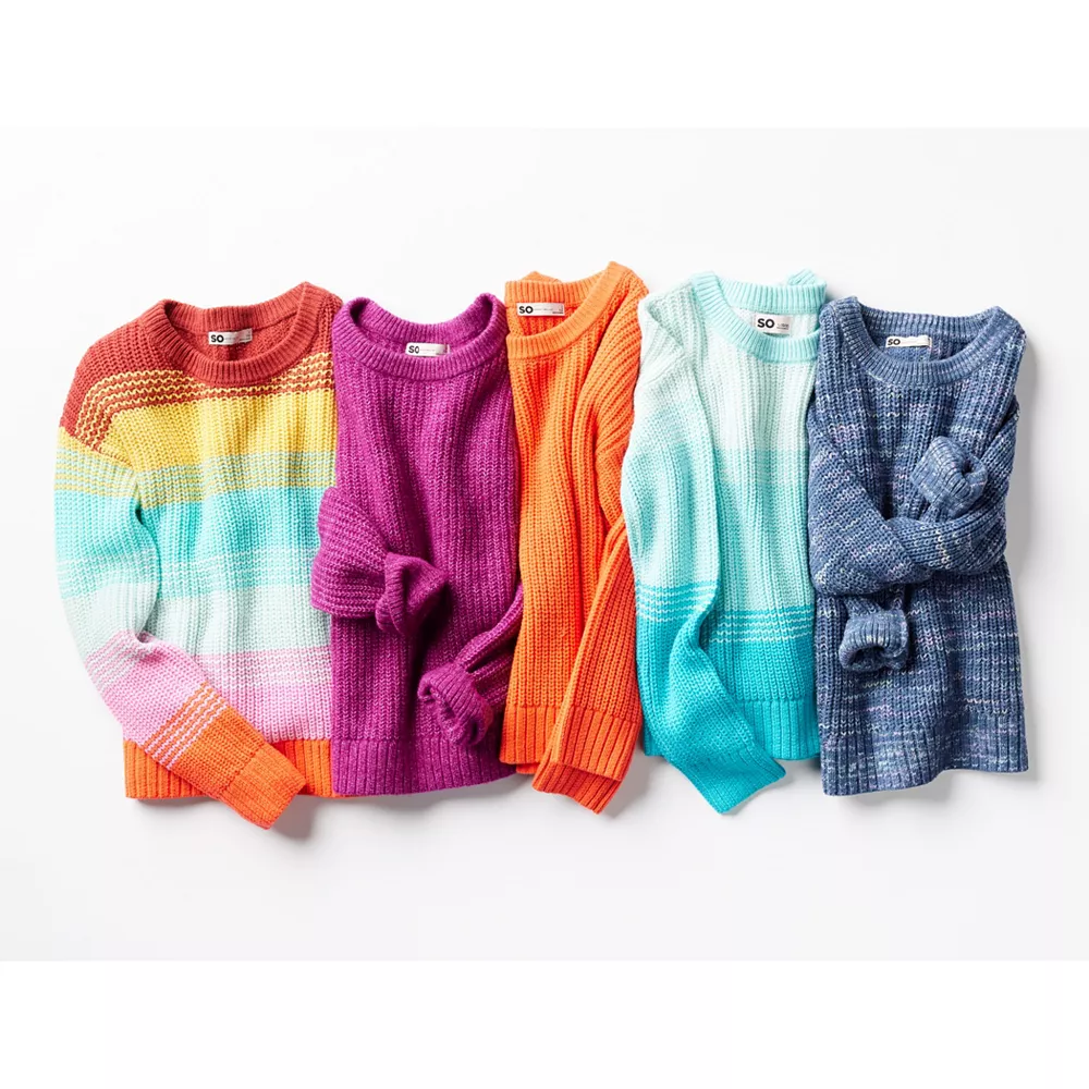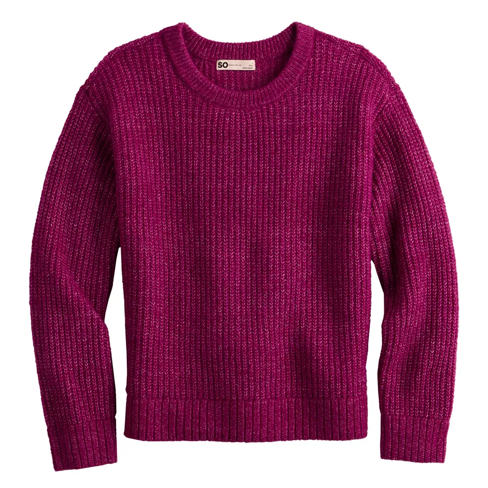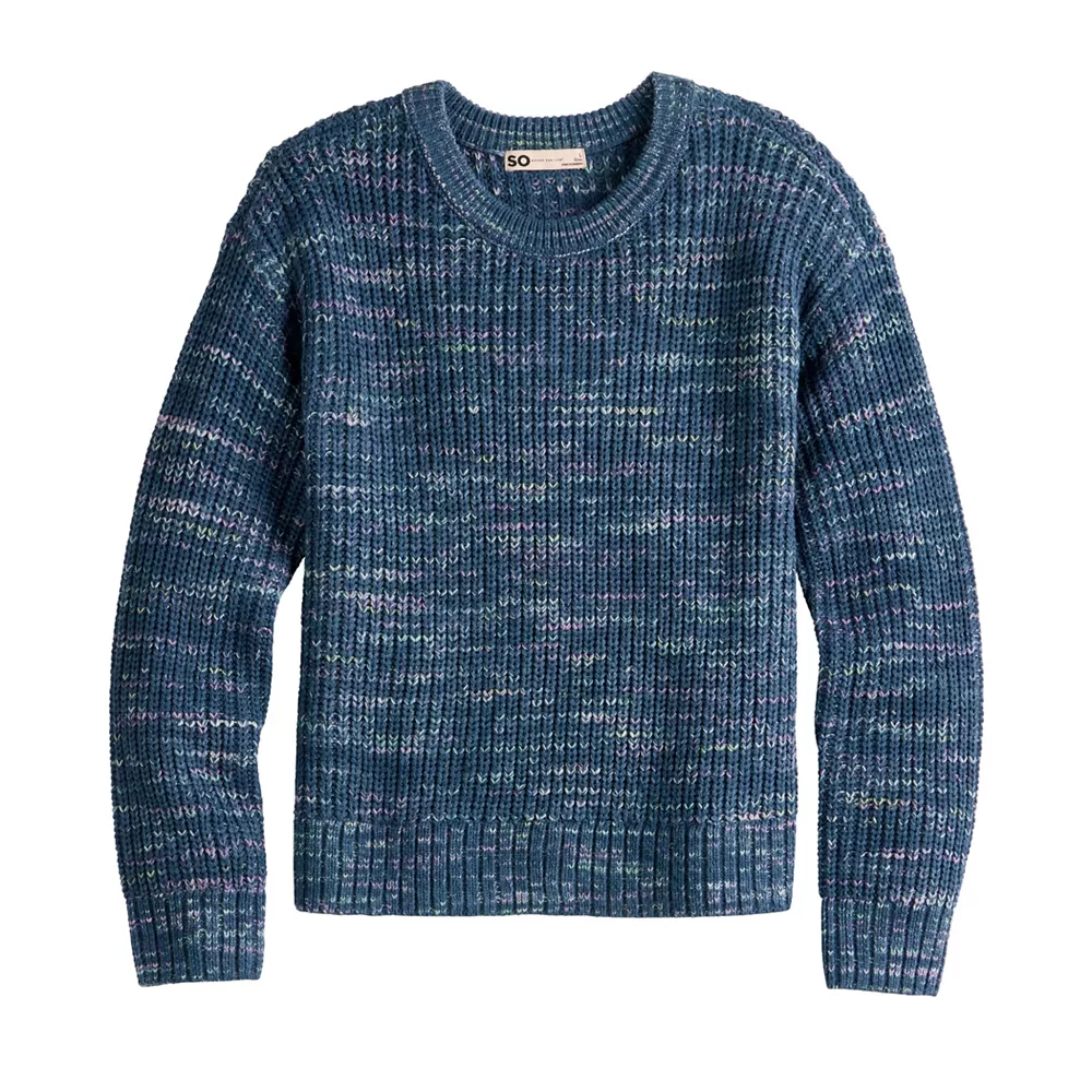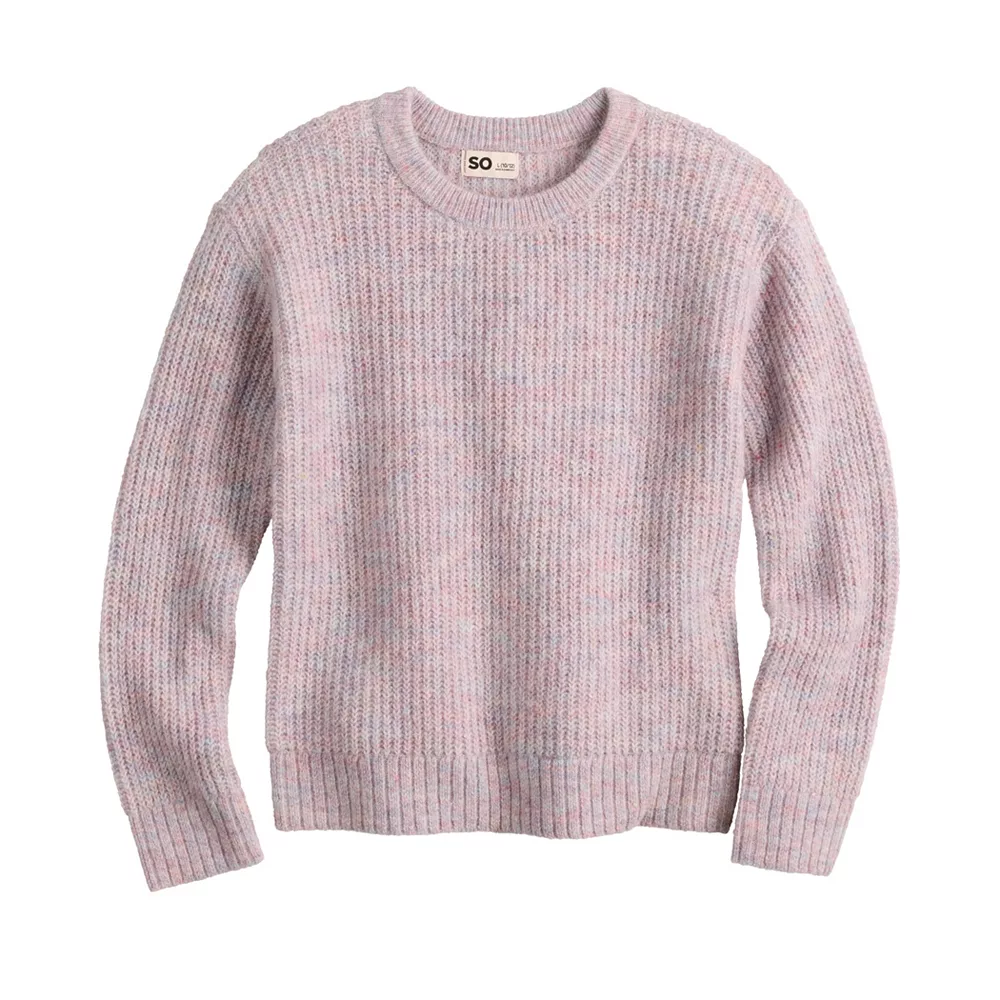 SO defines classic cold-weather coziness with this girls’ crewneck sweater.