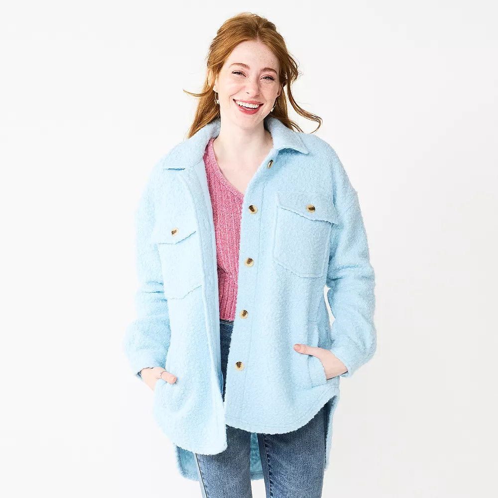 Stay warm and stylish in this oversized juniors’ sherpa shirt jacket from SO!