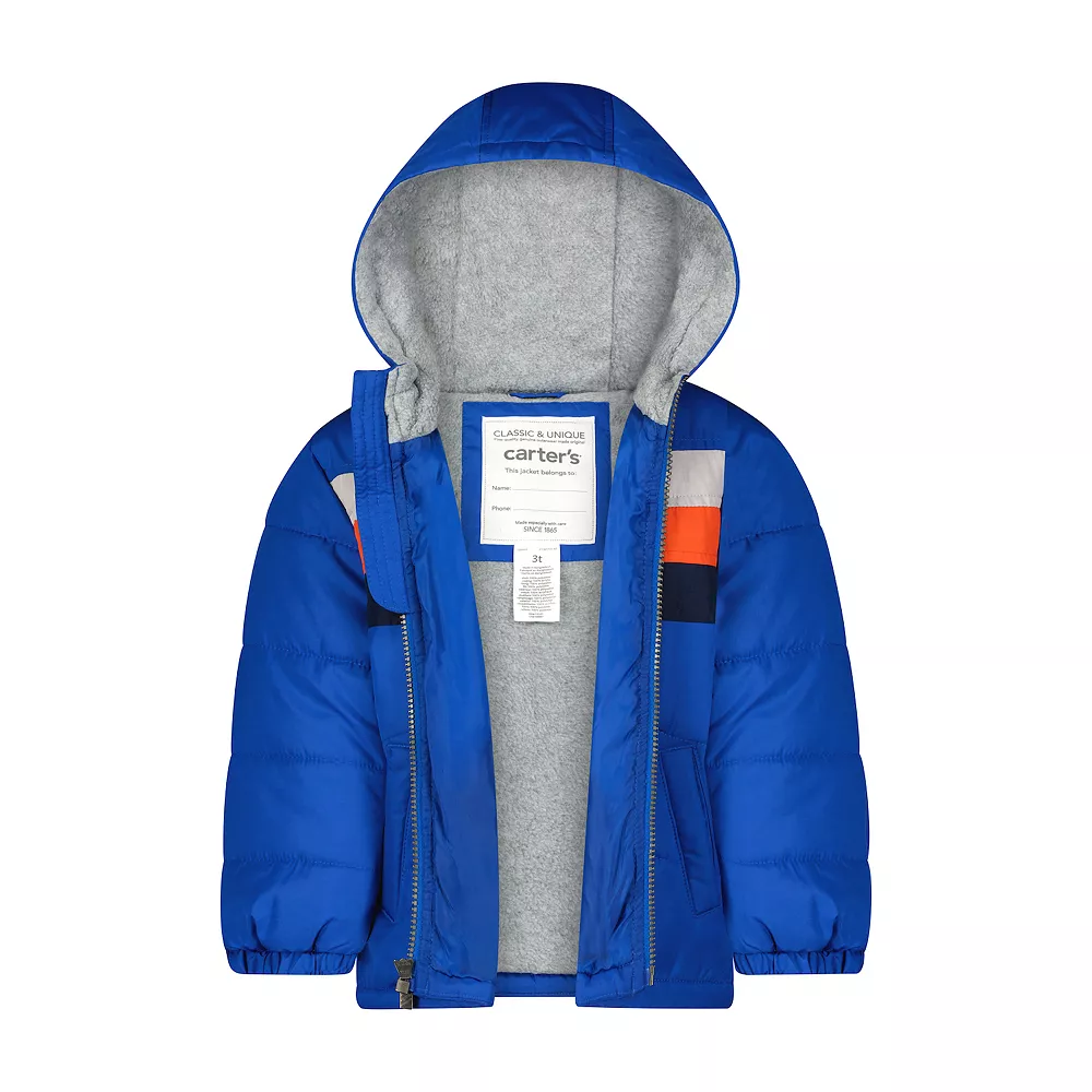 Make sure your little man stays warm and cozy in this fleece lined toddler boys’ colorblock puffer coat from Carter’s.