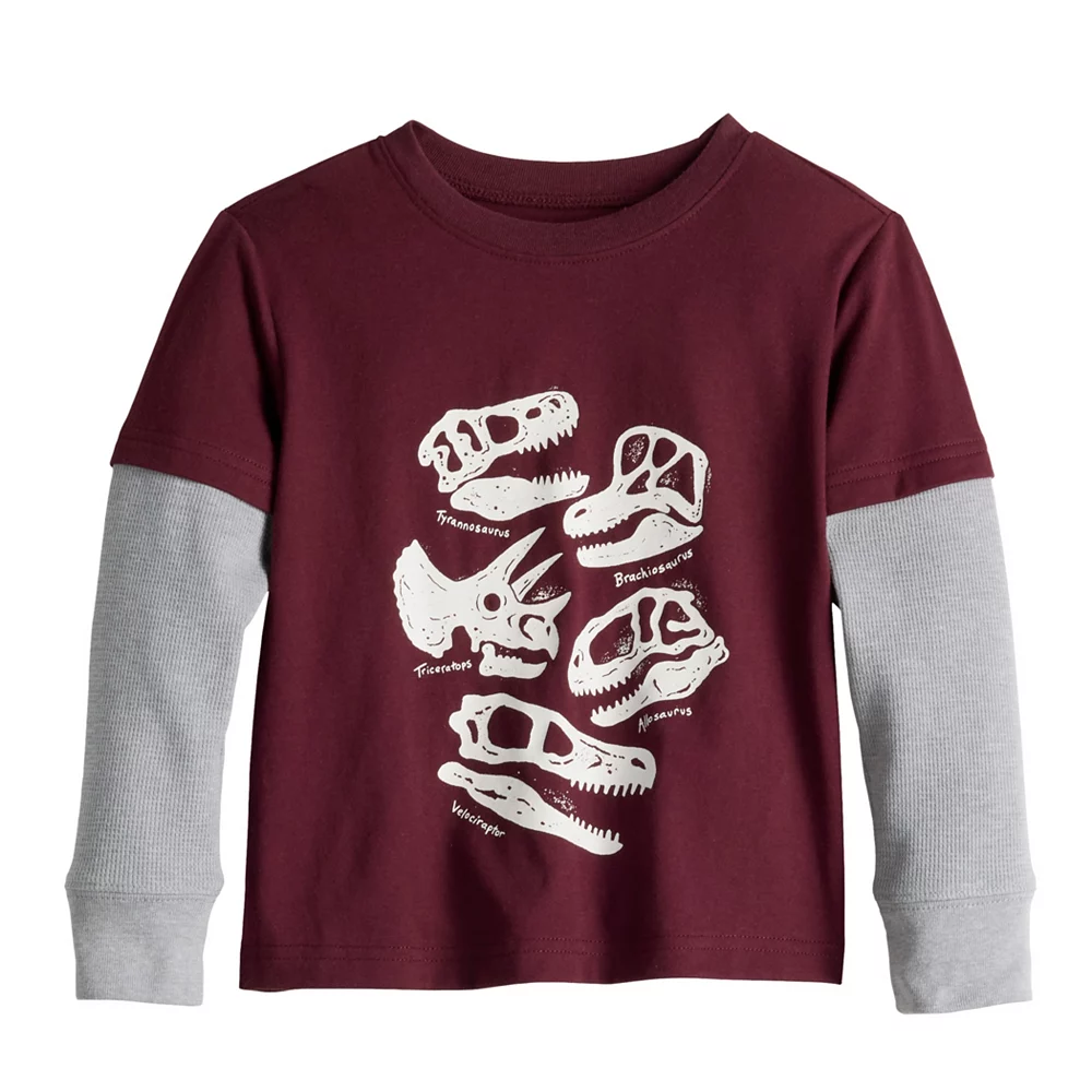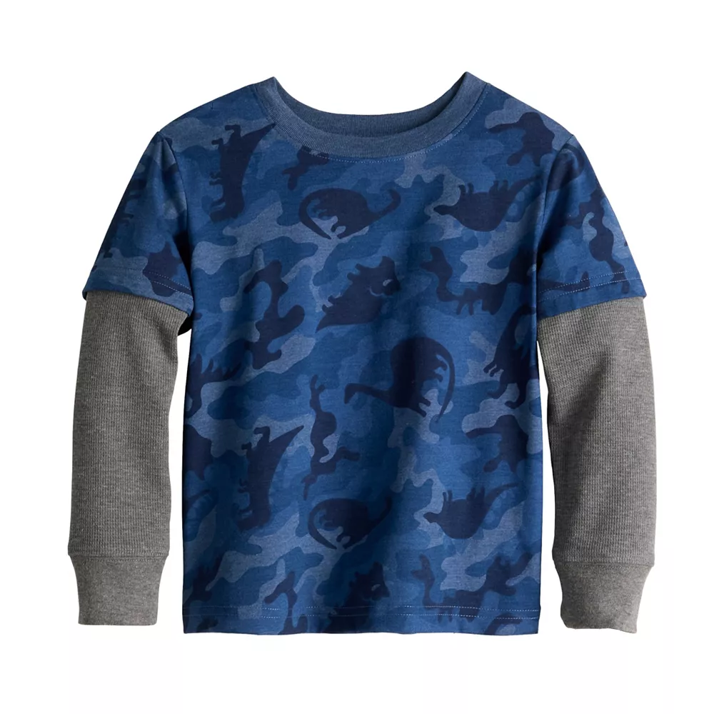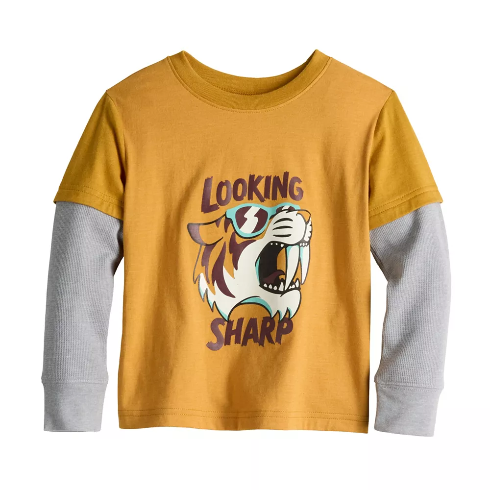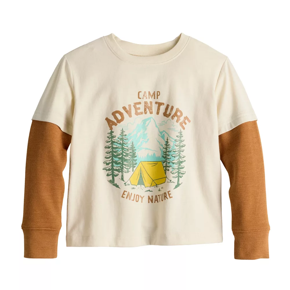 Your little skater dude will be on trend in this toddler boys’ faux-layered thermal sleeve tee from Jumping Beans.